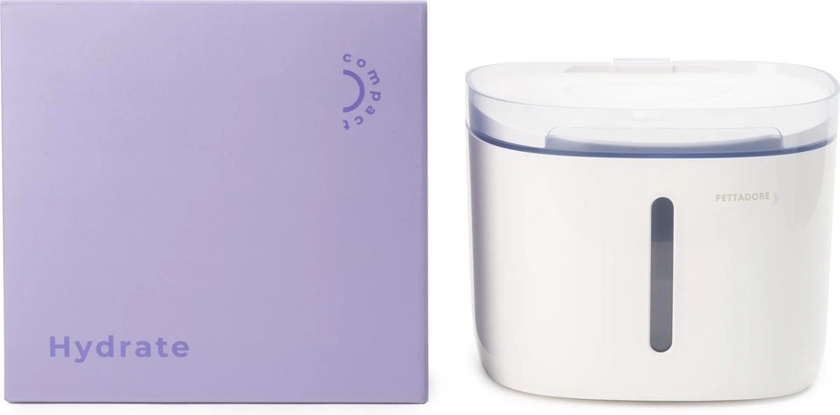 De smart drinkfontein Hydrate Compact van Pettadore is een slimme drinkfontein voor katten en honden. De waterfontein is verbonden met een app en heeft een waterreservoir van 1,9 liter. Het 4 filtersysteem en pomp houden het water schoon en zorgen voor veel zuurstof in het water. De kattenfontein heeft gedempt geluid en verbruikt weinig energie. De app weergeeft het waterniveau inclusief de werking en herinneringen van de smart drinkfontein!