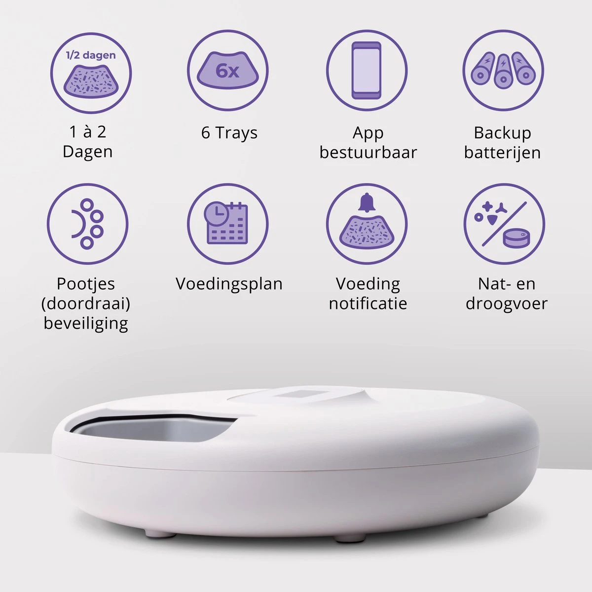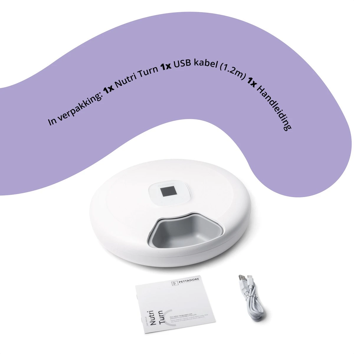Nutri Turn is de meest intelligente voerautomaat voor katten. Jij beslist, op basis van je voerplan, waarmee je de bak ‘s ochtends vult. Natvoer, droogvoer, vitamines en snoepjes… het kan allemaal. In de app stel je eenvoudig een dagelijks voedingsplan in. De Nutri Turn zorgt ervoor dat jouw kat voorzien is tot het moment dat je weer terugkomt. En duurt dat een keer wat langer, of valt de stroom uit terwijl je weg bent? Geen paniek! De Nutri Turn heeft de mogelijkheid voor back-up batterijen waardoor je met een gerust hart de deur uit kunt, wetend dat je kat volgens het voedingsschema kan eten.