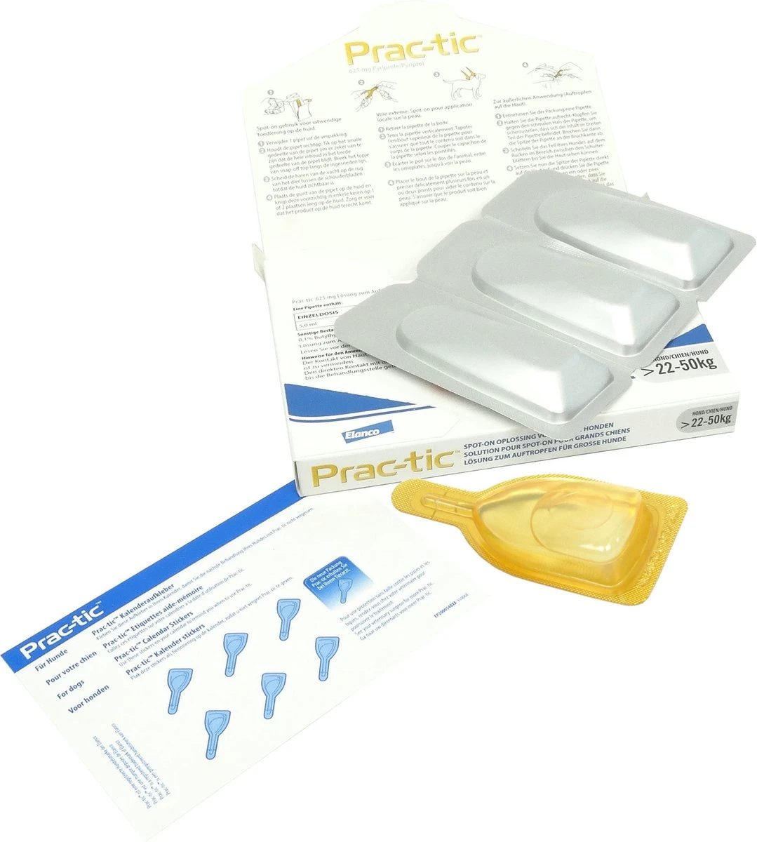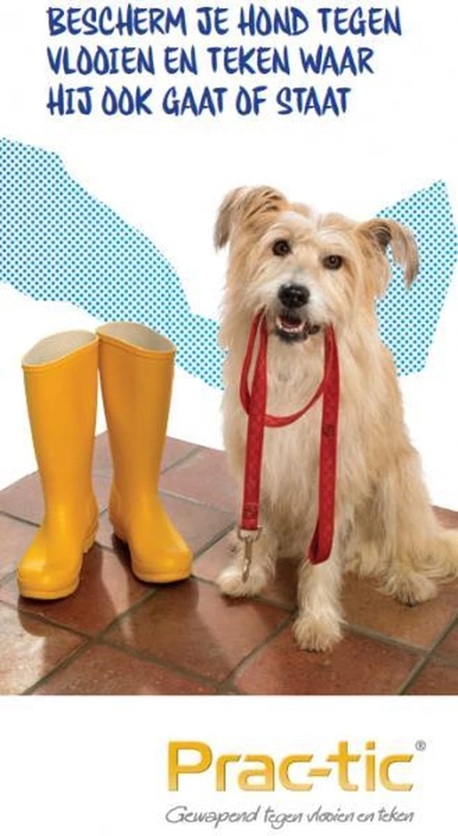 Prac-Tic helpt bij de preventie en behandeling van vlooien en teken besmettingen. Het is een spot-on Oplossing voor honden vanaf 1 tot 50 kilo. Het middel bevat pyriprole. Prac-Tic is het enige anti vlooien en teken middel dat speciaal gemaakt is voor honden hierdoor is het erg veilig voor de huid van uw hond. Prac-Tic is waterbestendig en daarom perfect voor de fanatiek zwemende viervoeters onder ons. Bewaar de pipetten zo lang mogelijk in de verpakking en bewaar het niet op een plek warmer dan 25 graden.