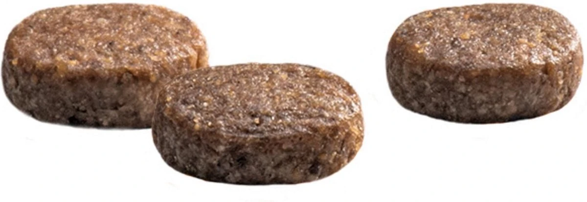 | Voedingswaarde | Gedehydreerde kip (24%), tarwe, sorghum, mais, dierlijke vetten (gevogelte), maisgluten, bietenpulp, gehydrolyseerde kippenlever, lignocellulose, zalmolie (0.6%), gist, mineralen (kaliumchloride), inuline (0.3%), kruidenextracten & Schüssler celzouten (siberean ginseng, cornu cervi degelatinatum, morus fruit, mume, cnidium, cyperus, polygonatum, Schüssler celzouten nr. 1, 2, 5, 7) (0.085%), glucosamine (500mg), chondroitine (500mg). |