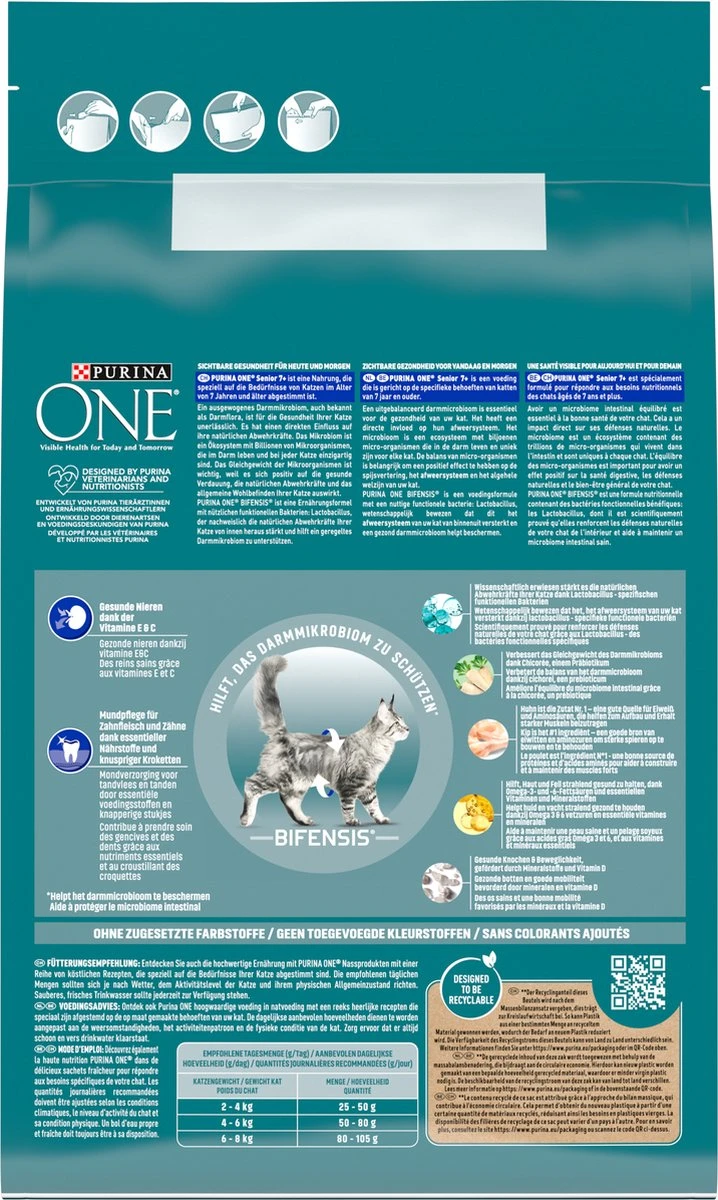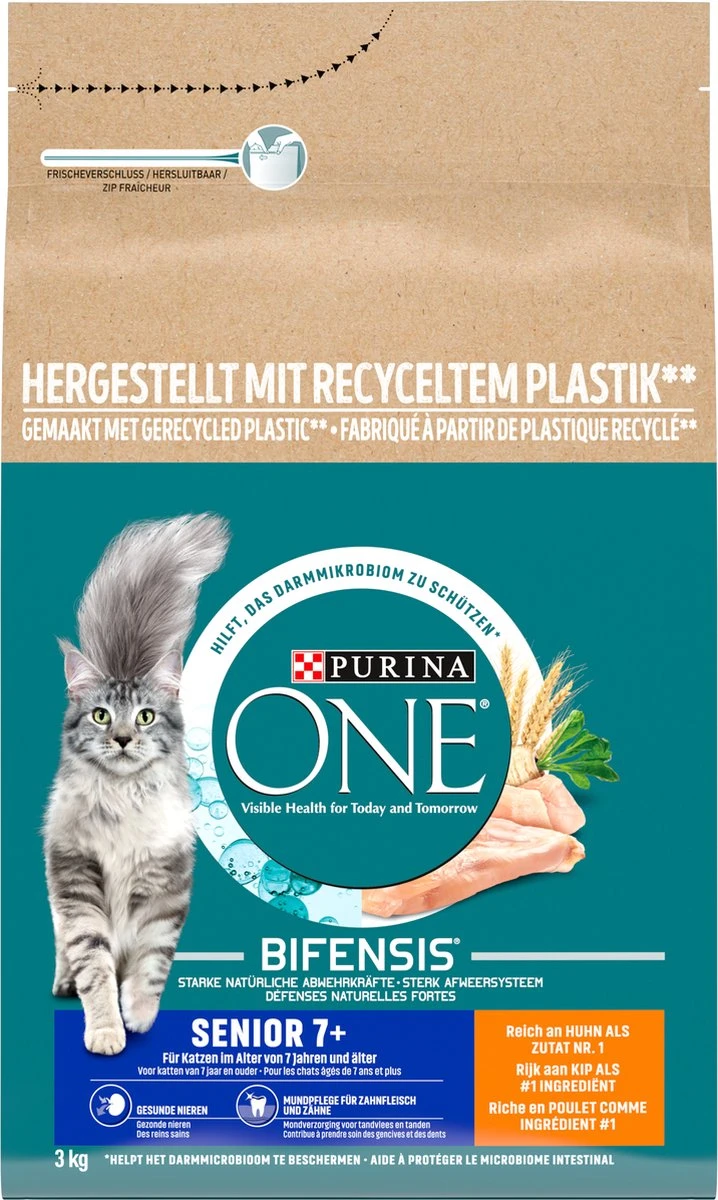 Het is belangrijk om goed voor jouw kat te zorgen, zeker als ze ouder wordt. Het ouderdomsproces veroorzaakt natuurlijke veranderingen in het lichaam van jouw kat die sommige vitale functies kunnen beïnvloeden. Purina One Senior 7+ bevat Bifensis, een unieke nutritionele formule met heilzame functionele bacteriën, waarvan wetenschappelijk bewezen is dat ze de natuurlijke afweer van jouw kat versterken van binnenuit.