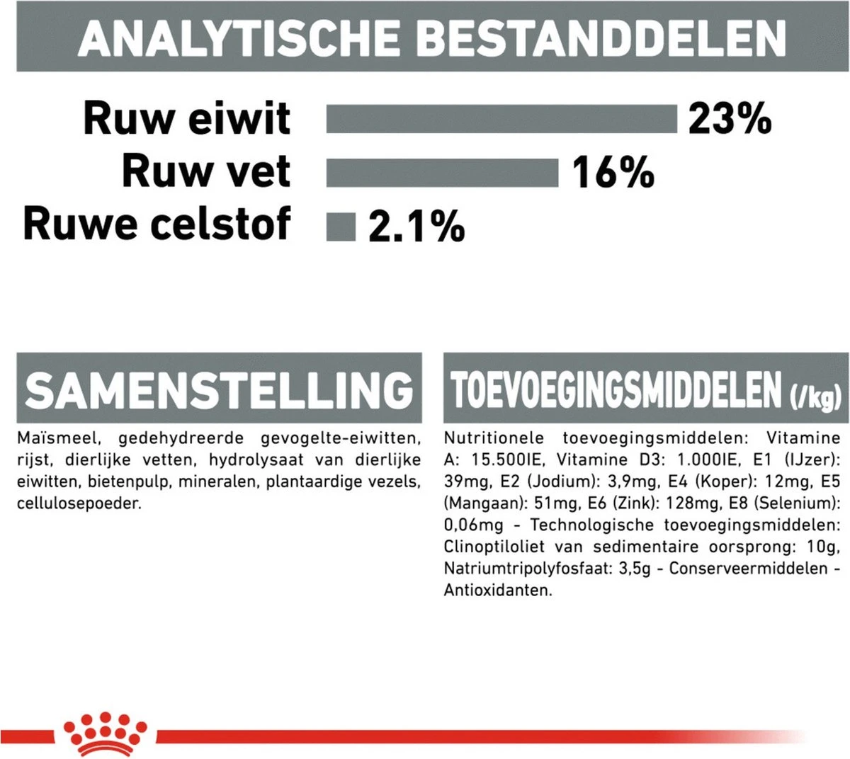 | Analytische bestandsdelen | ANALYTISCHE BESTANDDELEN: Ruw eiwit: 23,0% – Ruw vet: 16,0% – Ruwe as: 6,9% – Ruwe celstof: 2,1%. |
