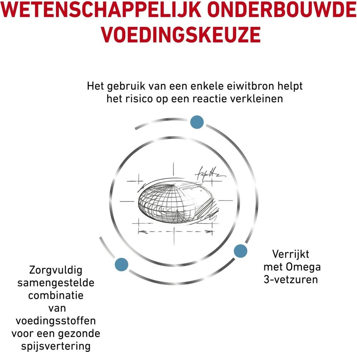 | Voedingswaarde | Samensteling: rijst, gedehydreerd eendenvlees, plantaardige vezels, hydrolysaat van gevogelte eiwitten, dierlijke vetten, rijstgluten, mineralen, visolie, sojaolie, tagetes (Afrikaan) extract (bron van luteïne) |