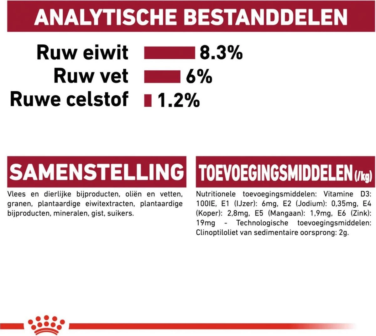 | Analytische bestandsdelen | analytische bestanddelen: ruw eiwit: 8,3% – ruw vet: 6,0% – ruwe as: 1,9% – ruwe celstof: 1,2% – vochtgehalte: 78,5% – vitamine e:150,0mg/kg. |