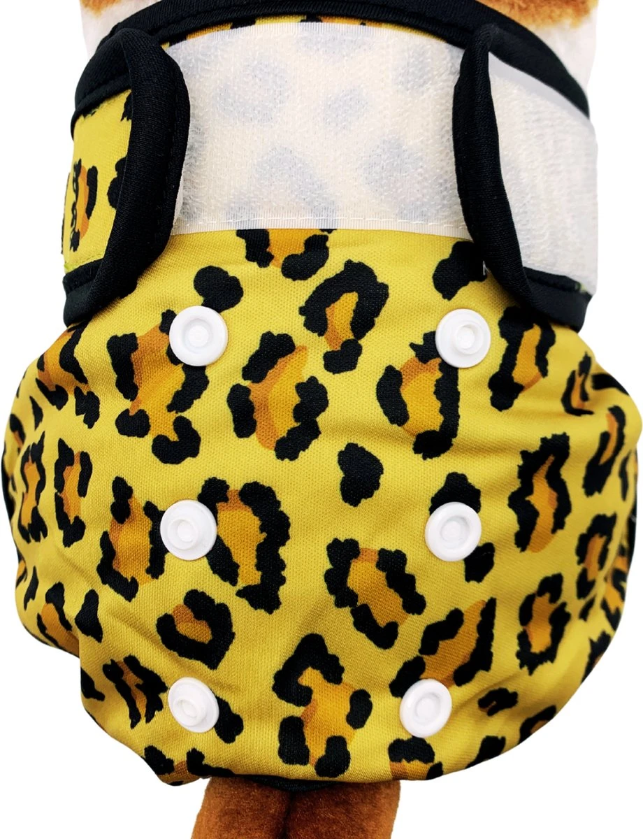 Wasbaar loopsheidbroekje in luipaard print, een prachtig alternatief voor de traditionele saaie (wegwerp) hondenluiers.