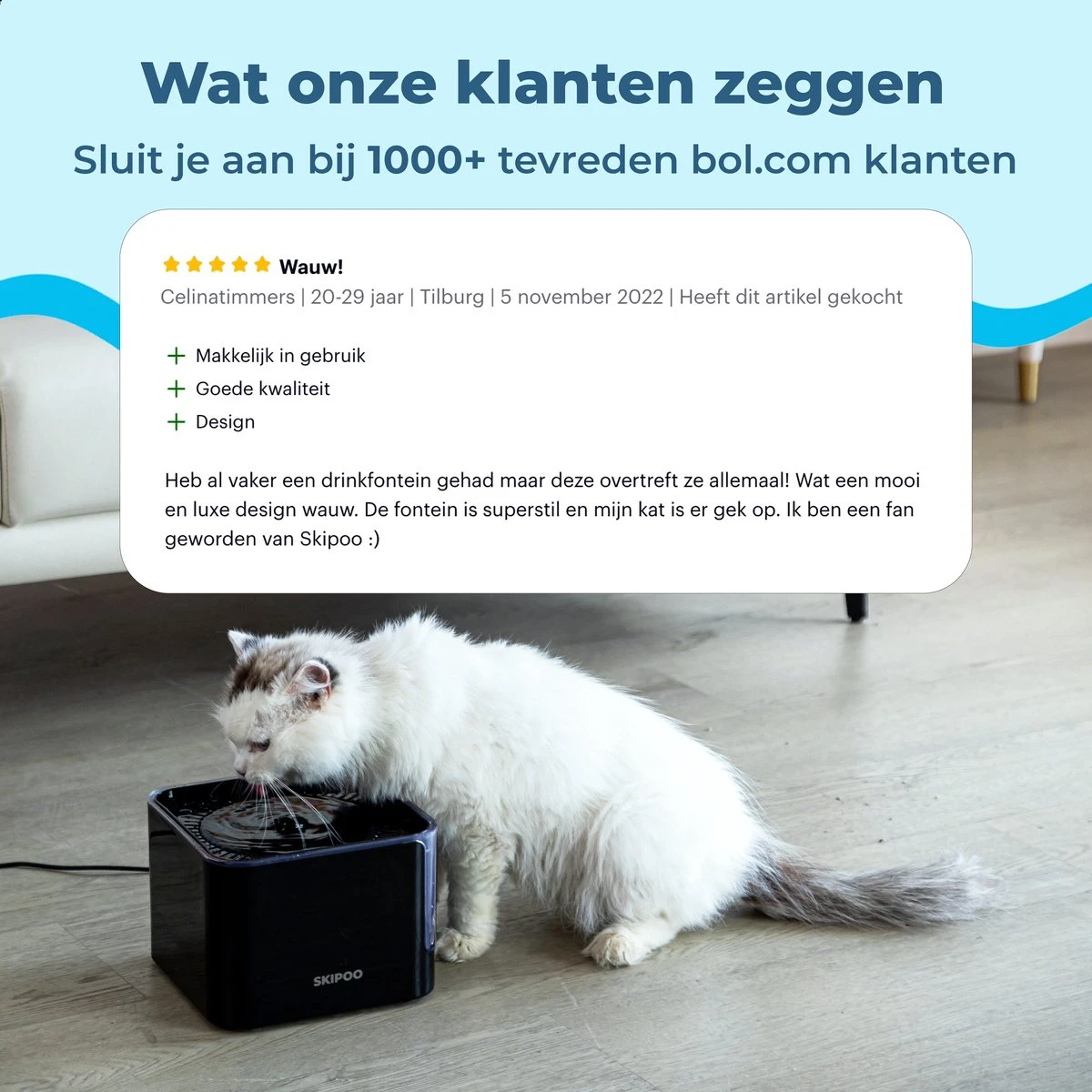 Een kat of hond is deel van jouw familie en verdient daarom het allerbeste. Bij Skipoo zijn we ons daarvan bewust. Onze kattenfontein heeft daarom een reservoir van 3 liter met 2 waterstanden en een 360° watercirculatie, zodat jouw viervoeter altijd vanuit iedere richting kan drinken.