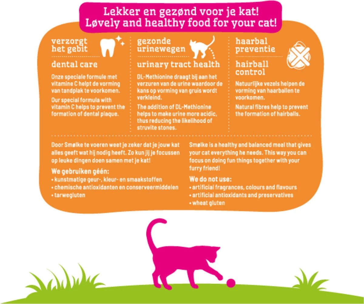 Smølke Adult with Chicken and Rice is een complete Alles-in-één kattenvoeding afgestemd op de behoefte van volwassen katten vanaf ongeveer 12 maanden. De voeding is samengesteld zonder tarwegluten en bevat natuurlijke vezels die helpen haarballen te voorkomen. Smølke Adult with Chicken and Rice is gemaakt met natuurlijke ingrediënten en heeft een uniek eiwitprofiel bereid met Nederlandse kip, MSC vis en Brits lam. Smølke Adult with Chicken and Rice is een gezonde en gebalanceerde voeding die iedere dag weer zorgt voor een blije en tevreden kat. Natuurlijk zonder kunstmatige geur-, kleur- en smaakstoffen en chemische antioxidanten!