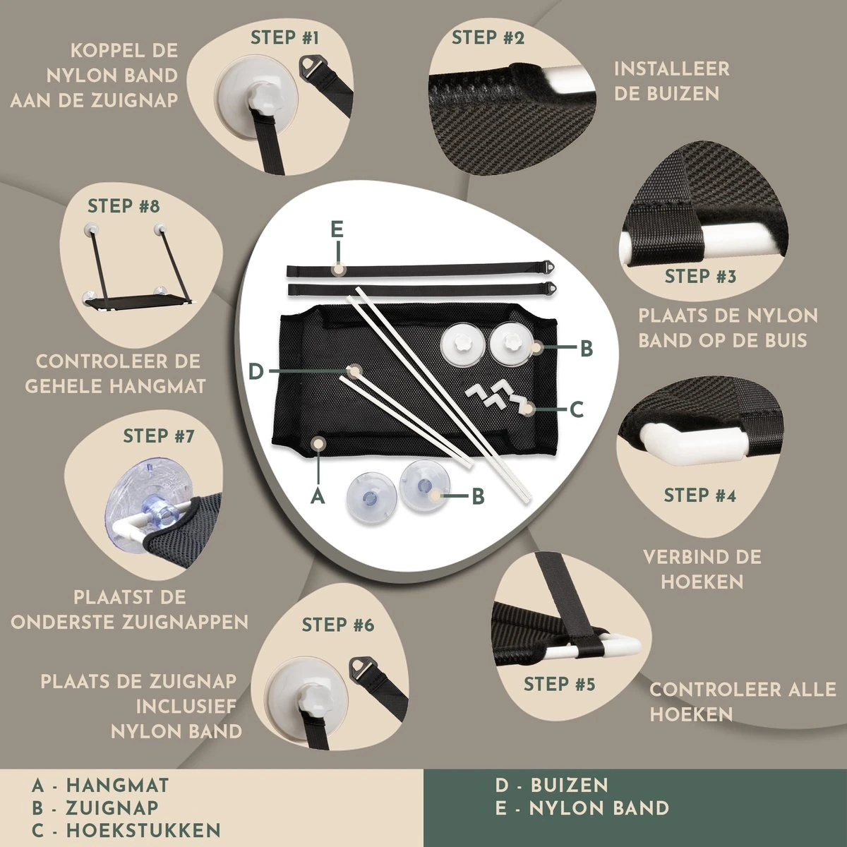 Controleer voor bevestiging of het oppervlak schoon, vetvrij en stabiel genoeg is. Aanbevolen wordt het oppervlak voor bevestiging nogmaals grondig te reinigen. Lees bijbehorende handleiding goed door voor montage/demontage van de kattenhangmat om installatie zo snel en soepel mogelijk te doorlopen.