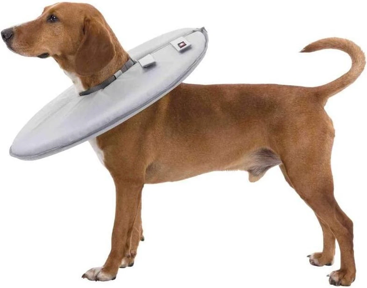 De Trixie Beschermkraag Polyester / Schuimstof Grijs beschermkap in maat L van 46-49 x24 cm voorkomt dat de hond aan hechtingen, aan verwondingen of huidirritaties likt. Veel honden hebben na operaties en huidproblemen de neiging aan de gevoelige plek te bijten of te likken: dat kan nu voorkomen worden met deze handige én comfortabele beschermkraag van Trixie. Deze kraag staat recht opzij in plaats van naar voren: zo wordt het zicht en gehoor niet beperkt en zal de hond of kat niet overal tegenaan stoten, zoals vaak het geval was met de ouderwetse ‘lampenkappen’. Deze beschermkap is gemaakt van polyester met schuimrubber, zachte materialen die voor veel draagcomfort zorgen en ook zorgen dat de hond gewoon kan liggen, snuffelen en eten en drinken zonder problemen.