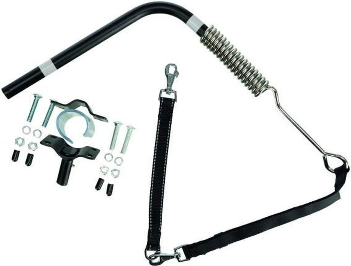 Deze hondfietsset, bestaande uit een afstandhouder met een zadelpenklem, een korte riem en een spiraalveer, zorgt ervoor dat je hond een ideale positie aanneemt naast je fiets zodat je beide handen vrij kunt houden om te sturen en te remmen. De springveer en de afstandhouder zijn gemaakt van metaal en zijn zeer stabiel. De geïntegreerde veerkussens vangen plotselinge snokken op, zodat je niet uit balans raakt. De set is ook geschikt voor grotere en zwaardere honden.