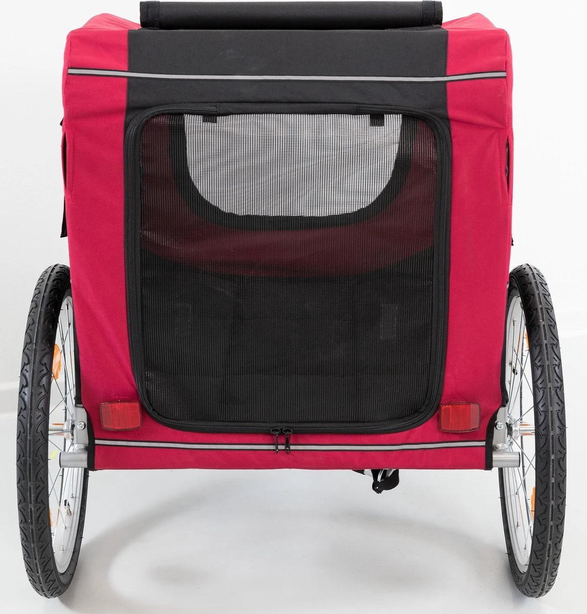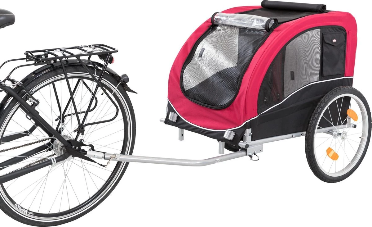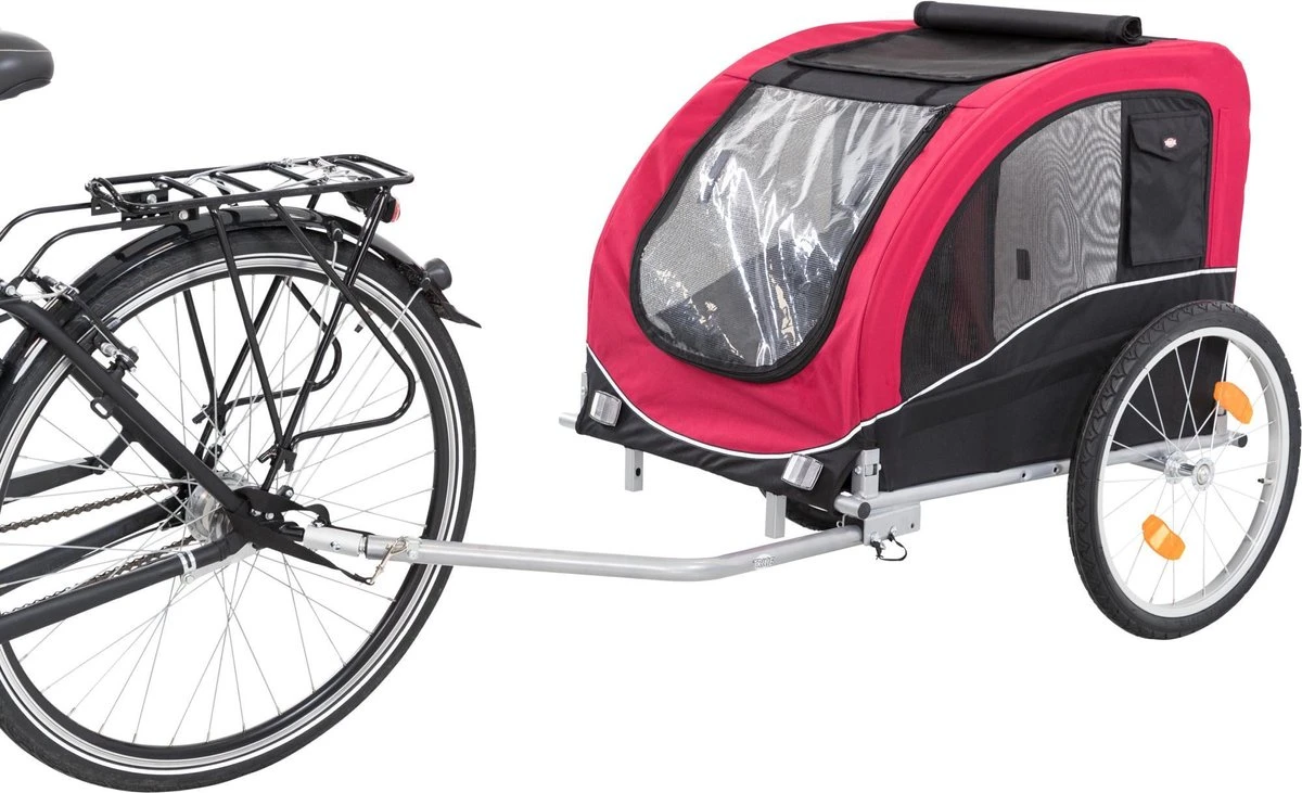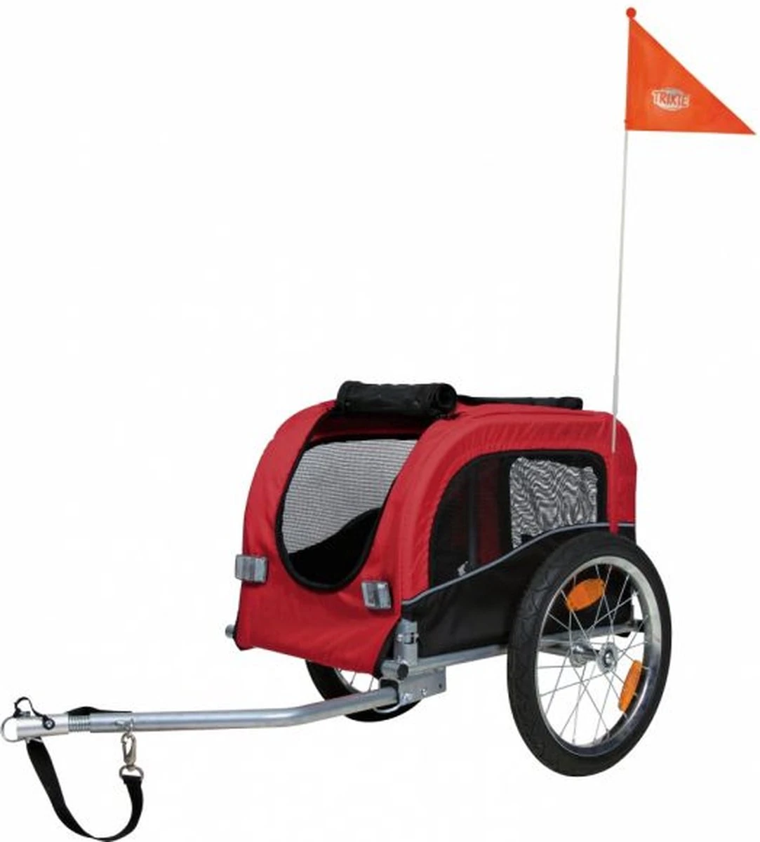 Met deze hondenfietskar van Trixie van 80 x 75 x 86 cm in zwart en rood neemt je je hond overal mee naartoe op reis met de fiets.