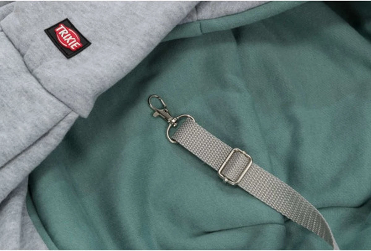 De Trixie Junior Hondentas Buikdrager Lichtgrijs / Mintgroen van 60 x 22 x 20 cm is een handige draagtas voor puppy’s en kleine honden, met instap aan de bovenkant en geïntegreerde korthouder. Deze comfortabele hondentas draag je aan de voorkant van het lichaam, waardoor je veel meer contact hebt met jouw dier. Door de handige instap-opening aan het bovenkant is het makkelijk het dier in en uit de tas te laten stappen en halen en de geïntegreerde korthouder voorkomt dat jouw hondje plotseling uit de tas kan springen. Het katoen/polyester draagt heerlijk zacht en de kleuren zijn helemaal van deze tijd!