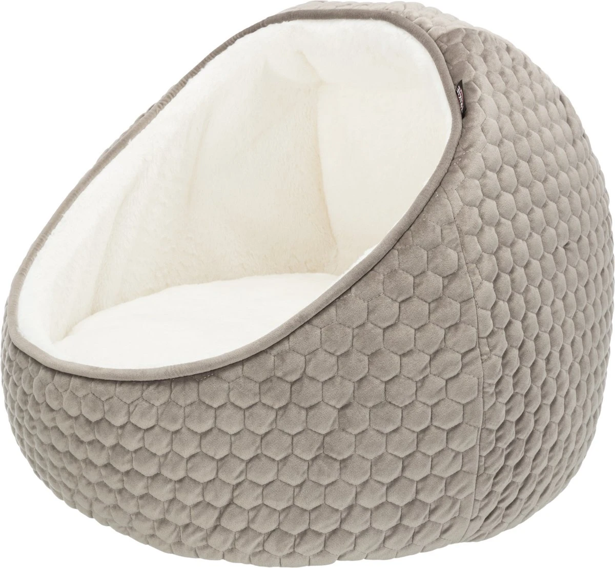 De Trixie Kattenmand Iglo Livia Roze / Creme 45 x 45 x 33 cm is een knusse kattenmand in velourslook met pluche binnenkant en wendbaar kussen. In deze mand voelt jouw kat zich heerlijk veilig! Door de ronde vorm is jouw kat aan bijna alle kanten beschermd en kan hij comfortabel tegen de hoge randen aanliggen. De buitenkant van het mandje is uitgevoerd in een leuke velours look en het kattenbed heeft een binnenkant met doorgestikte pluche bekleding. Door de polyestervlies en schuimrubber vulling ligt jouw kat stevig en de slipvaste onderkant zorgt dat jouw dier gemakkelijk in en uit de mand kan stappen. Het leuke kussen is bovendien wendbaar en heeft twee verschillende designs, zodat jij zelf de uitstraling van het mandje kan kiezen!