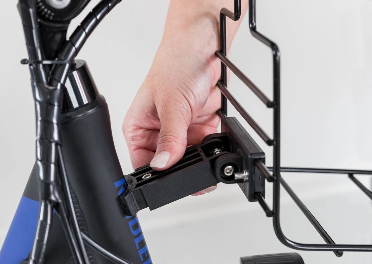 Deze mand is ook als vervoerstas te gebruiken: door het gemakkelijke click & go systeem kun je hem zo van de beugel afhalen en meenemen als stevige draagtas.