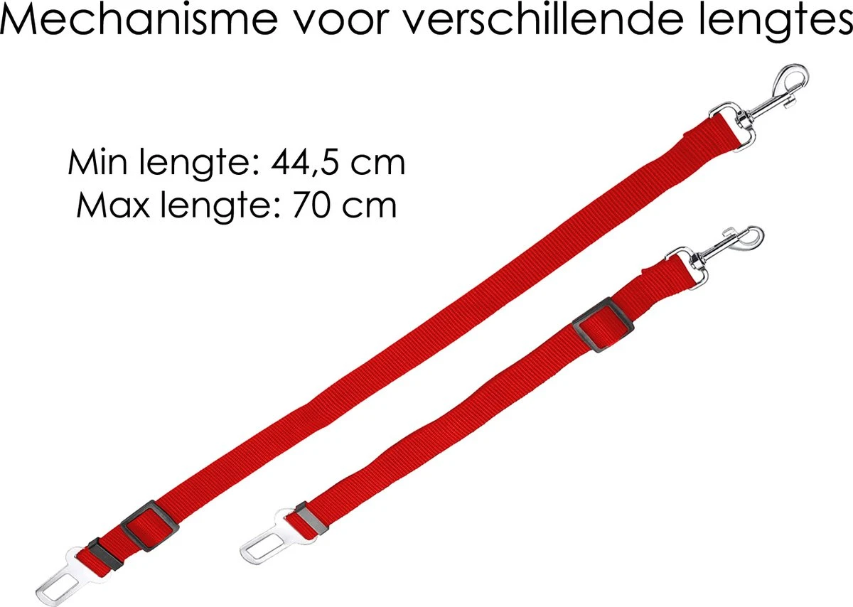 De rode autogordel voor hondentuig van Nomfy garandeert een veilige reis voor jou, je hond en andere weggebruikers. Doordat de hondenriem auto in lengte verstelbaar is, kan deze voor zowel grote als kleine honden gebruikt worden. Verschillende lengtes van de hondengordel en de roterende karabijnhaak zorgen voor optimaal comfort en veiligheid voor je hond tijdens een autorit. Je trouwe viervoeter kan gemakkelijk gaan liggen, zitten of staan, zonder onderweg gevaar te veroorzaken. Gebruik de hondenriem eenvoudig door de karabijnhaak aan de halsband van je hond te bevestigen en de andere kant in de veiligheidssluiting in je auto te klikken. Twee simpele stappen en je bent klaar om te gaan! Deze hondenriem autogordel is niet geschikt voor de auto’s van het merk Volvo.