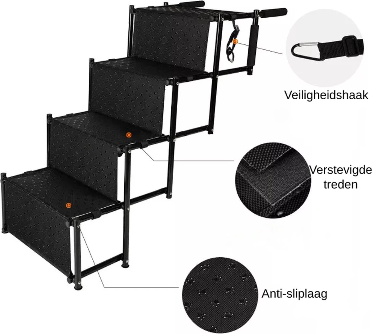 Honden tot 70KG kunnen de trap gebruiken, de trap is gemaakt van duurbaar metaal en de treden zijn verstevigd met plastic.