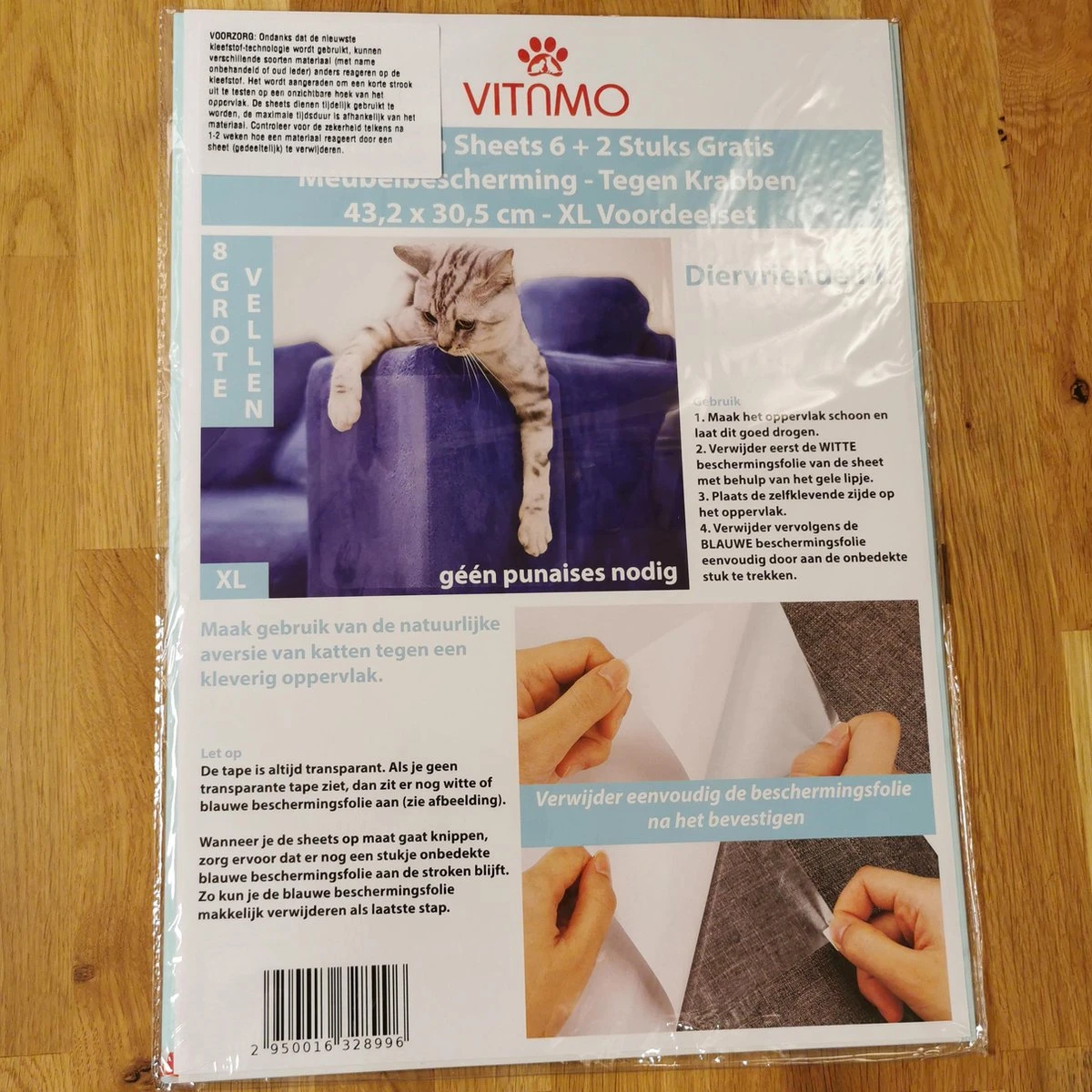 Train eenvoudig je kat door gebruik te maken van zijn natuurlijke afkeer van een kleverig oppervlak! Met Vitamoâ„¢ Anti Krab Training Sheets leer je je katten om niet meer aan je meubels te krabben. Na het plaatsen van de dubbelzijdig klevende sheets stoppen veel katten vanzelf met het krabben van je meubels, ook als je de bescherming er na een paar weken weer afhaalt! Bevorder de nieuwe gewoonte door in de buurt van je meubels een echte krabpaal te plaatsen. Door de transparante look van deze vellen vallen ze minder op zul je je er niet zo snel aan storen.