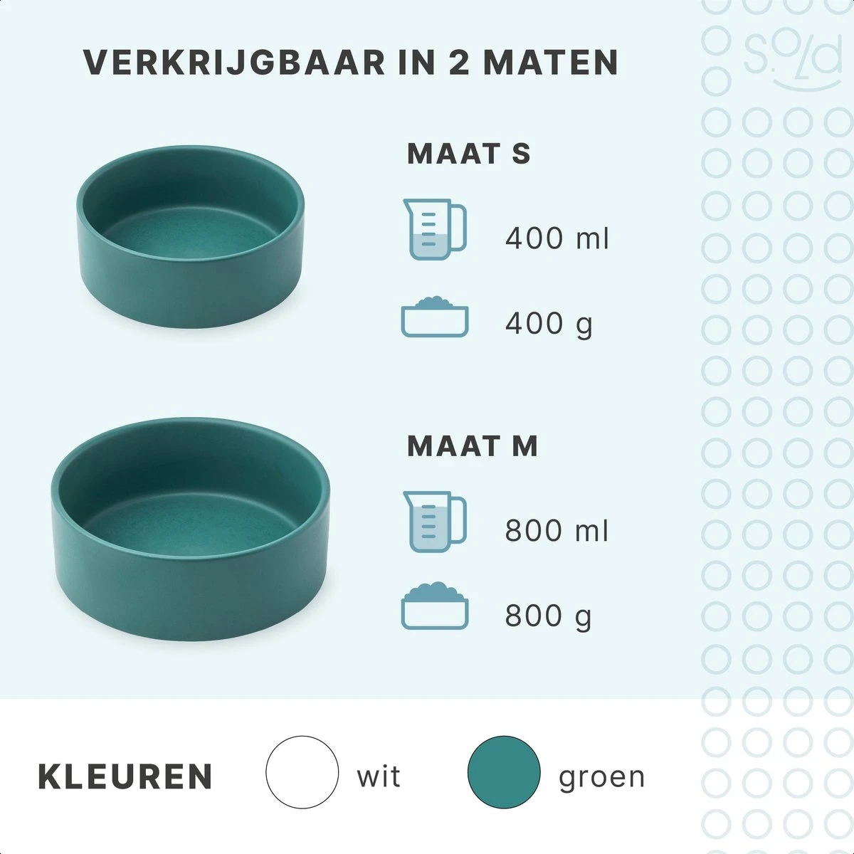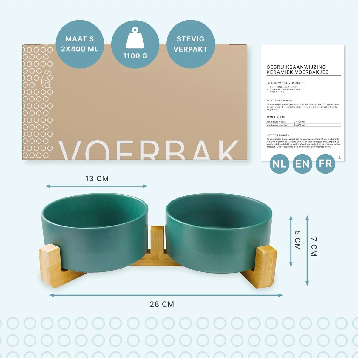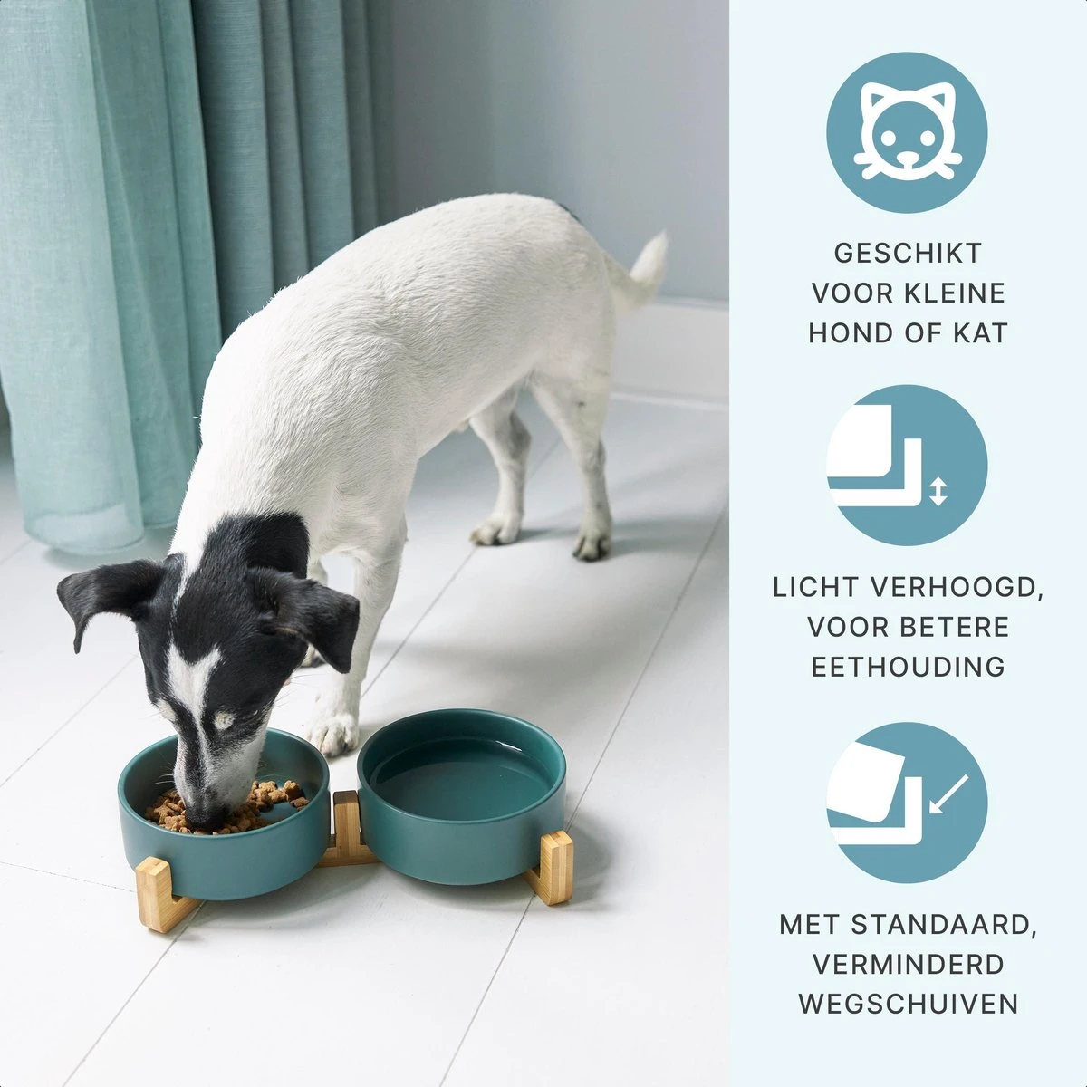 De voerbakjes in maat S zijn met een inhoud van 2x 400 ml geschikt voor een kleine hond of een kat. Door de licht verhoogde standaard (2 cm) eet jouw huisdier in een betere lichaamshouding wat kan bijdragen aan een vermindering van gewrichts- en spijsverteringsproblemen. Door de voerbakjes in de standaard te plaatsen voorkom je dat de bakjes wegschuiven en blijft de boel netjes.